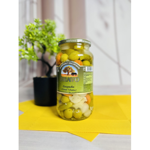Основою коктейлю з 7 овочів Bravo Gazpacha - є великі зелені оливки, їх у банці найбільше, так що іноді ці консерви називають маринованими оливками з овочами. Крім них, до складу входять морква, цибуля, огірки, часник і цвітна капуста. Завдяки такому багатству складу коктейль є неймовірно популярною закускою, адже в ній є овочі на будь-який смак.