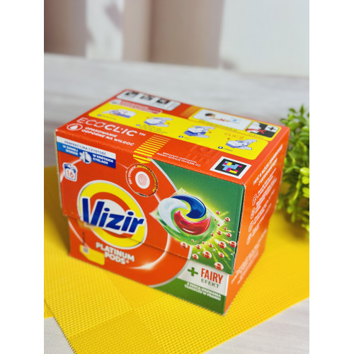 Vizir Platinum Pods – це нова лінійка капсул від відомого бренду Vizir. 4-х компонентні капсули мають у своєму складі гель для прання, концентроване засоб для виведення плям, кондиціонер для тканин і сильнодіючі ензими. Видалення навіть найстійкіших плям від крові, кави, трави, жиру, плям від поту, а також багатьох інших.