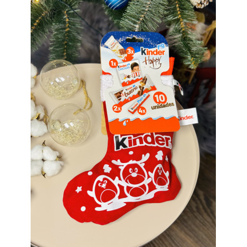 Подарунковий набір "Kinder шкарпетка" – це святковий набір солодощів у формі шкарпетки, наповнений різноманітними ласощами від Kinder, такими як: Kinder Country: ніжний молочний шоколад з молочно-горіховою начинкою. Kinder Schoko-Bons: молочний шоколад з молочно-горіховою начинкою. Kinder Schokolate/Figurina: молочний шоколад у фігурній формі. Kinder Maxi: велика плитка молочного шоколаду.